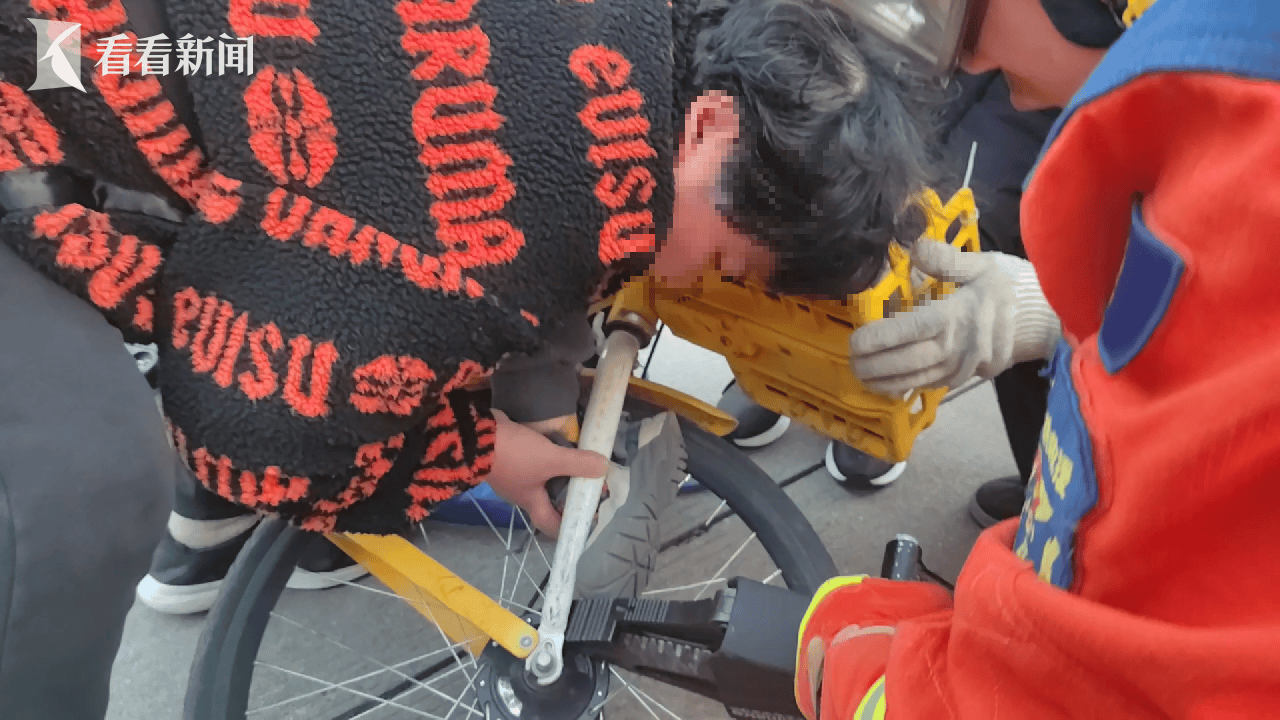 2月12日下午17时13分,上海市宝山区上海大学宿舍楼西门,一名5岁左右小男孩脚卡共享单车前轮内,家长情急之下报警求助。宝山区大场消防救援站消防员到场后发现,小男孩的右脚卡入共享单车前轮辐条与车架之间,若强行拉扯可能造成更严重的伤害,情况十分危急,消防救援人员立即展开救援。